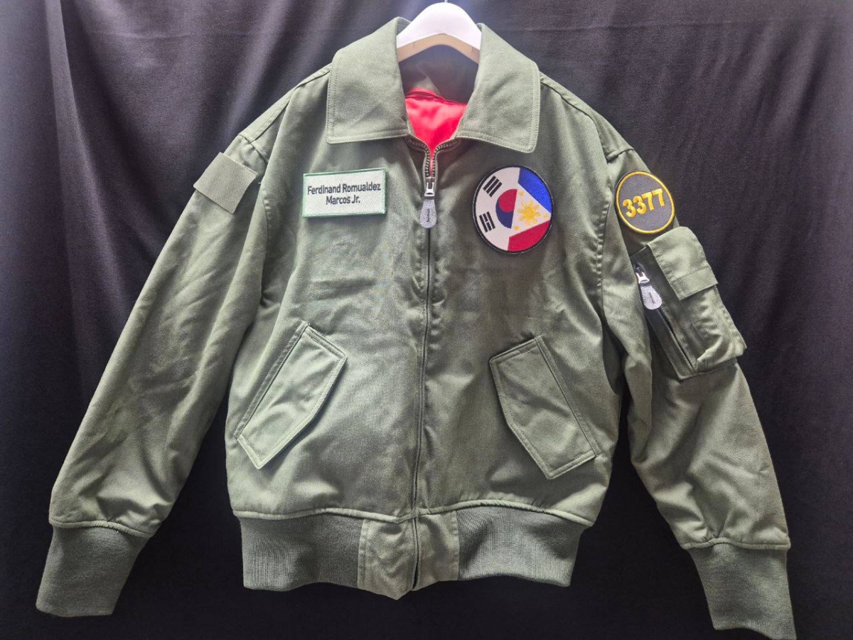 어린 시절 조종사가 꿈이었으며 영화 '탑건'의 팬인 마르코스 대통령을 위한 맞춤형 만찬 선물이다. 점퍼에 부착된 패치에는 '3377' 네 자리 숫자가 선명하다. 이는 3일 양국 수교 77주년을 맞은 것을 뜻한다.