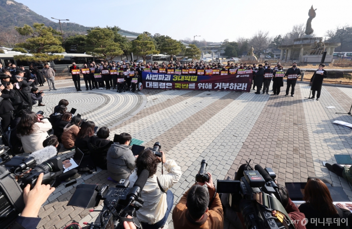 국민의힘은 5일 서울 종로구 청와대 사랑채 앞 분수대에서 사법개혁 3법(법왜곡죄·재판소원제·대법관 증원)의 위헌성을 알리는 장외투쟁을 진행했다. 지난 3일 여의도 국회에서 규탄대회를 열고 청와대까지 행진한 지 이틀 만이다. 이 자리에서 장동혁 대표는 "이 대통령이 3개 악법을 통과시키는 의사봉을 두드리는 건 대한민국을 무너뜨리는 망치질"이라고 주장했다.