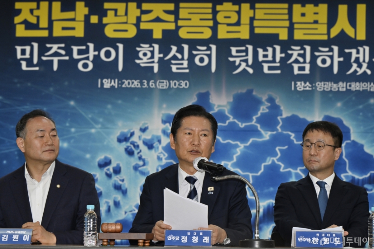 ![[영광=뉴시스] 박기웅 기자 = 정청래 더불어민주당 대표가 6일 오전 전남 영광군 영광농협 대회의실에서 열린 민주당 전남 현장 최고위원회에서 발언을 하고 있다. 2026.03.06. pboxer@newsis.com /사진=박기웅](https://thumb.mt.co.kr/cdn-cgi/image/f=avif/21/2026/03/2026030610583940008_1.jpg)