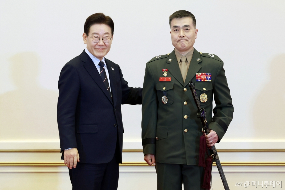 ![[서울=뉴시스] 최동준 기자 = 이재명 대통령이 6일 청와대 영빈관에서 열린 2026년 준장 진급 장성 삼정검 수여식에서 박정훈 국방부 조사본부장(준장)에게 삼정검을 수여한 뒤 기념촬영을 하고 있다. 2026.03.06. photocdj@newsis.com /사진=최동준](https://thumb.mt.co.kr/cdn-cgi/image/f=avif/21/2026/03/2026030616565072942_1.jpg)
