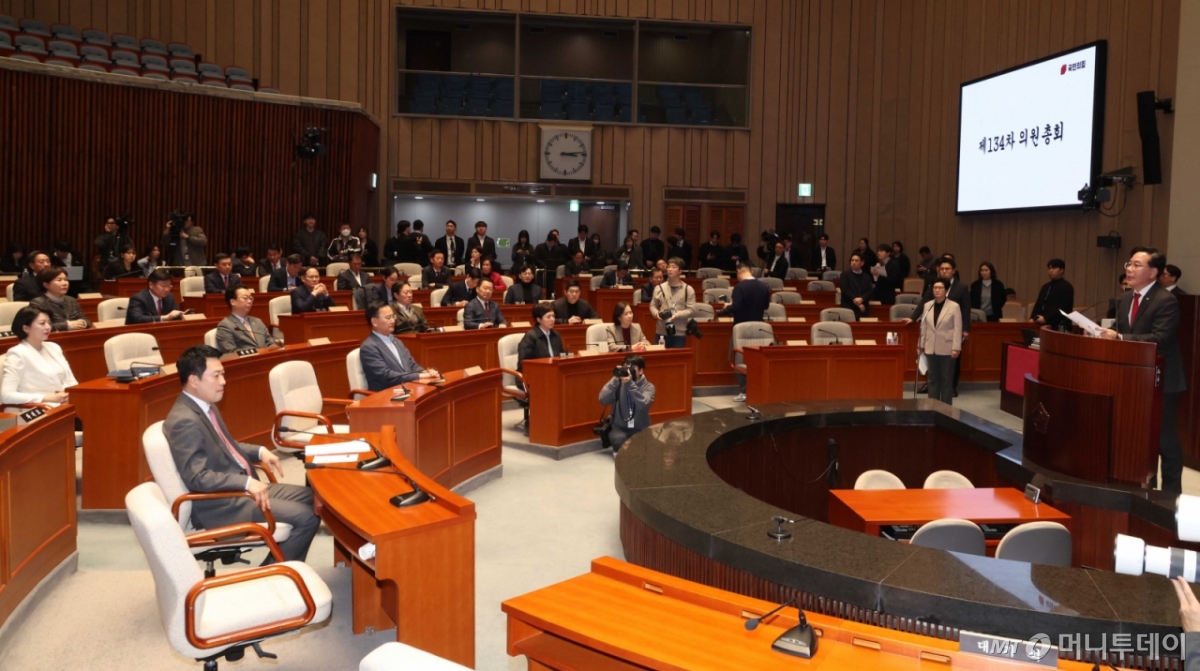 ![[서울=뉴시스] 조성봉 기자 = 송언석 국민의힘 원내대표가 9일 오후 서울 여의도 국회에서 열린 의원총회에서 발언을 하고 있다. 2025.03.09. suncho21@newsis.com /사진=조성봉](https://thumb.mt.co.kr/cdn-cgi/image/f=avif/21/2026/03/2026030910272410252_1.jpg)