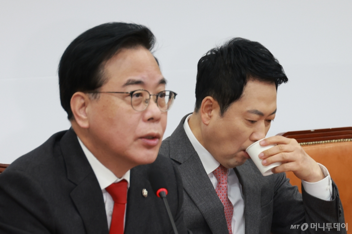 [the300] [서울=뉴시스] 고승민 기자 = 송언석 국민의힘 원내대표가 9일 서울 여의도 국회에서 열린 최고위원회의에서 발언하는 동안 장동혁 대표가 물을 마시고 있다. 2026.03.09. [email protected] /사진=고승민 9일 송언석 국민의힘 원내대표. 독자들의 PICK! "네 몸 확인하겠다" 덮친 기획사 대표...고백한 여배우 "몇 명이랑 잤나 세어 보자" 장항준 19금 발언 파묘 한석준 "이어폰 없이 영상 보는 노인, 미워말라" 시끌 '곰탕집'에 1인 기획사 차린 이하늬, 60억 벌었다...어떻게