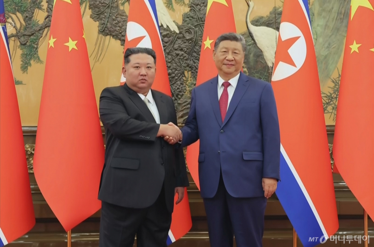 ![[서울=뉴시스] 북한 조선중앙TV는 지난 4일 김정은 국무위원장이 중국 베이징 인민대회당에서 시진핑 중국 국가주석과 '북중 정상회담'을 했다고 5일 보도했다. 사진은 김 위원장과 시 주석이 악수하는 모습. (사진=조선중앙TV 캡쳐) 2025.09.05. photo@newsis.com *재판매 및 DB 금지](https://thumb.mt.co.kr/cdn-cgi/image/f=avif/21/2026/03/2026031009370463050_1.jpg)