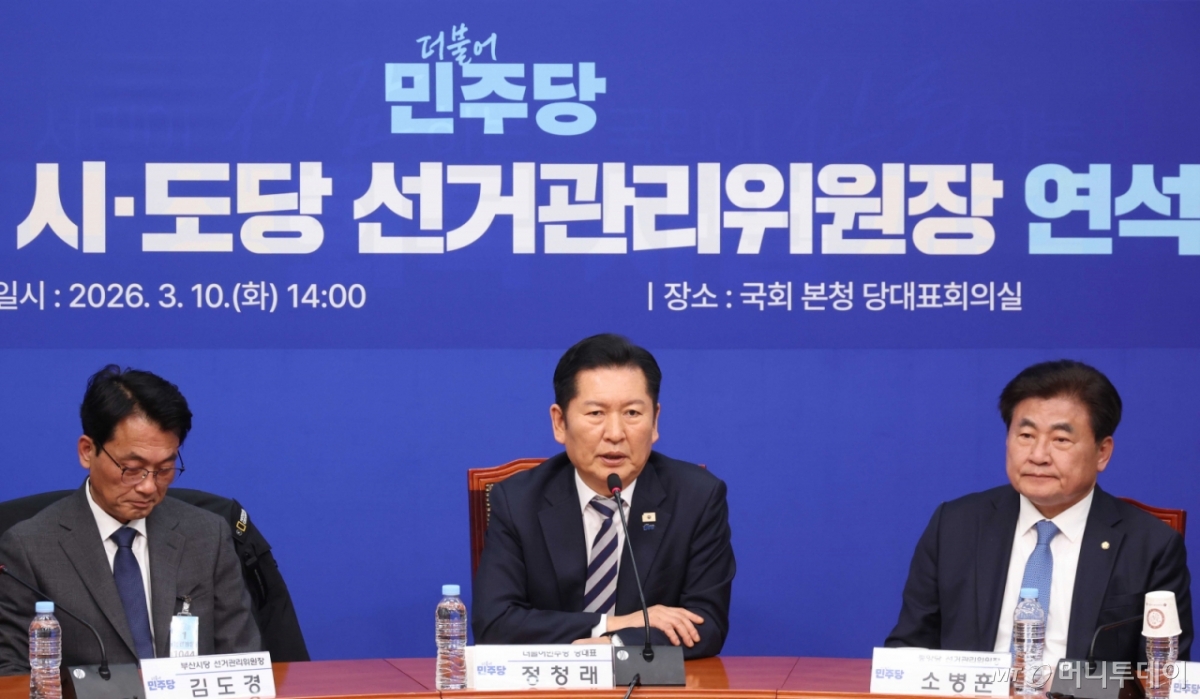 ![[서울=뉴시스] 조성봉 기자 = 정청래 더불어민주당 대표가 10일 오후 서울 여의도 국회에서 열린 중앙당 및 시·도당 선거관리위원장 연석회의에서 발언을 하고 있다.왼쪽부터 김도경 부산시당 선관위원장, 정 대표, 소병훈 중앙당 선관위원장. 2025.03.10. suncho21@newsis.com /사진=조성봉](https://thumb.mt.co.kr/cdn-cgi/image/f=avif/21/2026/03/2026031014554568667_1.jpg)