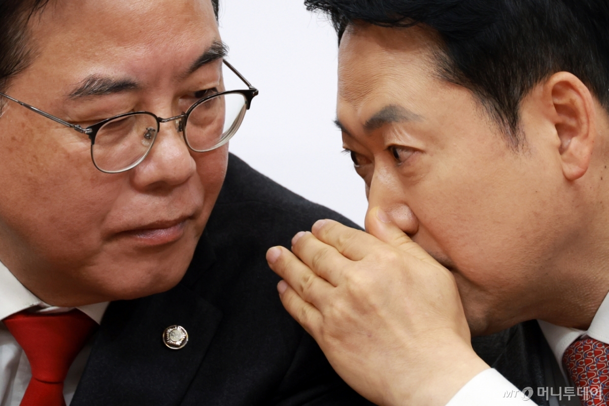 ![[서울=뉴시스] 고승민 기자 = 국민의힘 장동혁 대표와 송언석 원내대표가 9일 서울 여의도 국회에서 열린 최고위원회의에서 대화하고 있다. 2026.03.09. kkssmm99@newsis.com /사진=고승민](https://thumb.mt.co.kr/cdn-cgi/image/f=avif/21/2026/03/2026031015071549131_1.jpg)