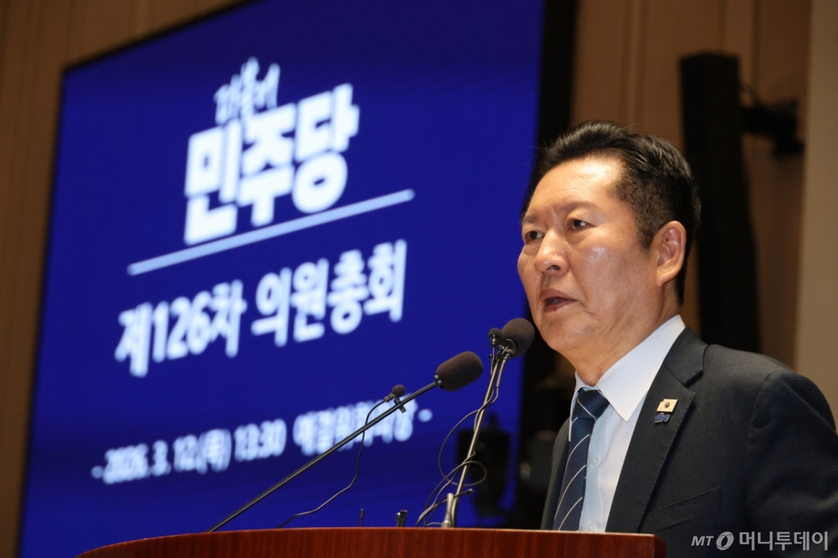 ![[서울=뉴시스] 조성봉 기자 = 정청래 더불어민주당 대표가 12일 오후 서울 여의도 국회에서 열린 의원총회에서 발언을 하고 있다.2026.03.12. suncho21@newsis.com /사진=조성봉](https://thumb.mt.co.kr/cdn-cgi/image/f=avif/21/2026/03/2026031210375377314_1.jpg)