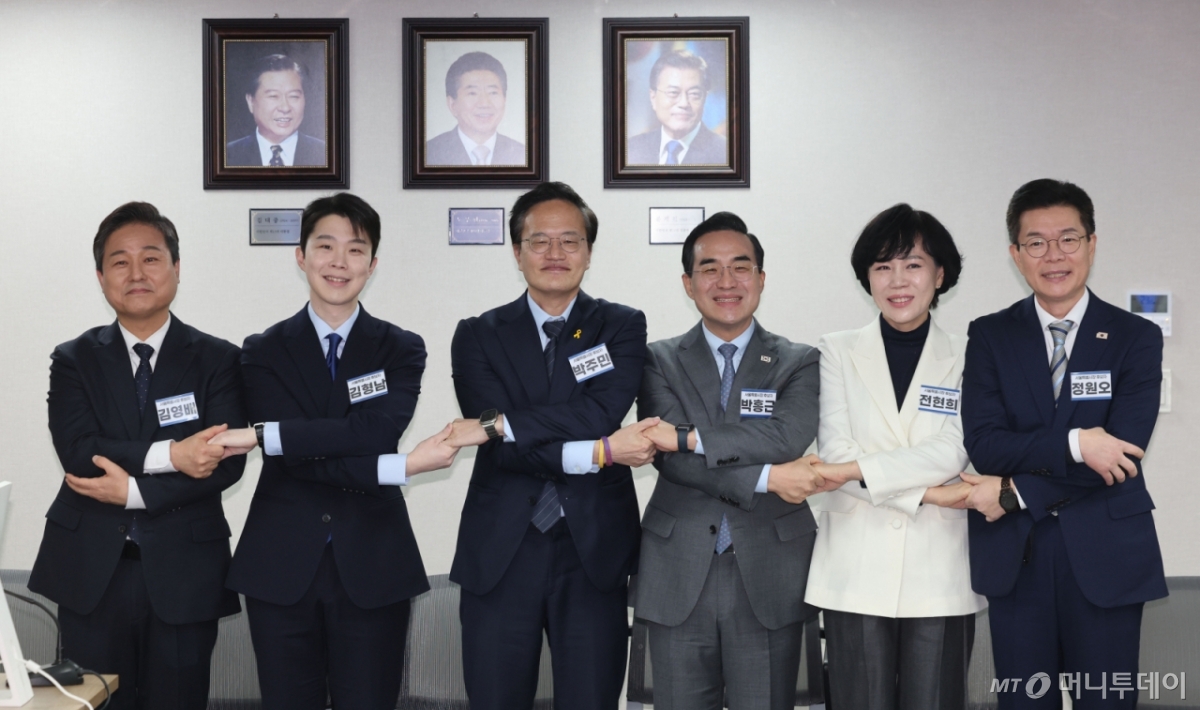 ![[서울=뉴시스] 권창회 기자 = 23일 오전 서울 영등포구 더불어민주당 당사에서 열린 중앙당공천관리위원회 2차 회의 및 광역단체장 후보자 면접에서 서울시장 후보들이 손을 맞잡고 기념촬영을 하고 있다. 왼쪽부터 김영배 의원, 김형남 전 군인권센터 사무국장, 박주민·박홍근·전현희 의원, 정원오 성동구청장. 2026.02.23. kch0523@newsis.com](https://thumb.mt.co.kr/cdn-cgi/image/f=avif/21/2026/03/2026031219194842057_1.jpg)