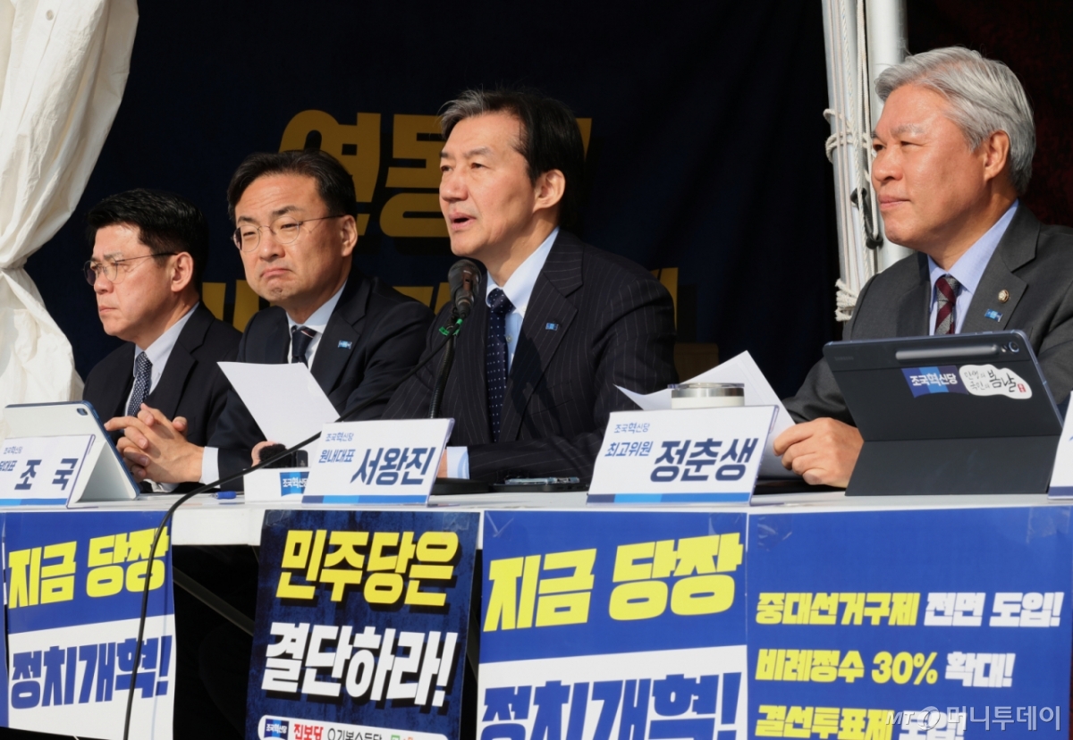 ![[서울=뉴시스] 김금보 기자 = 조국 조국혁신당 대표가 12일 오전 서울 여의도 국회 본청 앞에 진보4당이 마련한 정치개혁 촉구 농성장에서 열린 최고위원회 회의에서 발언을 하고 있다. 2026.03.12. kgb@newsis.com /사진=김금보](https://thumb.mt.co.kr/cdn-cgi/image/f=avif/21/2026/03/2026031220472835364_1.jpg)