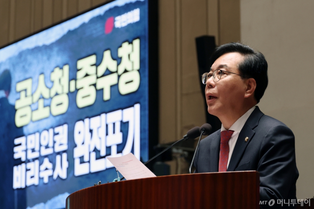 이날 더불어민주당 주도로 국회 본회의에 상정될 예정인 공소청·중대범죄수사청(중수청) 법에 대해 송 원내대표는 "수사 기능 해체 악법"이라며 "사법 시스템을 근본부터 무너뜨리는 입법폭주면서 수사 기관의 독립성을 빼앗아 권력 손아귀에 쥐여주겠다는, 범죄자 세상 만들기 프로젝트의 일환"이라고 비판했다.