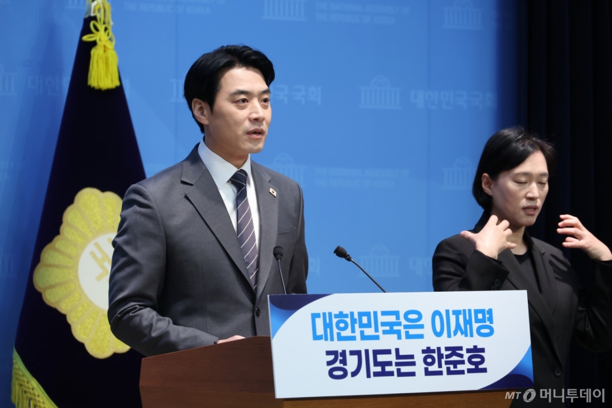 ![[서울=뉴시스] 조성봉 기자 = 한준호 더불어민주당 의원이 12일 오전 서울 여의도 국회 소통관에서 경기도지사 출마선언을 하고 있다. 2026.02.12. suncho21@newsis.com /사진=조성봉](https://thumb.mt.co.kr/cdn-cgi/image/f=avif/21/2026/03/2026032010253411978_1.jpg)