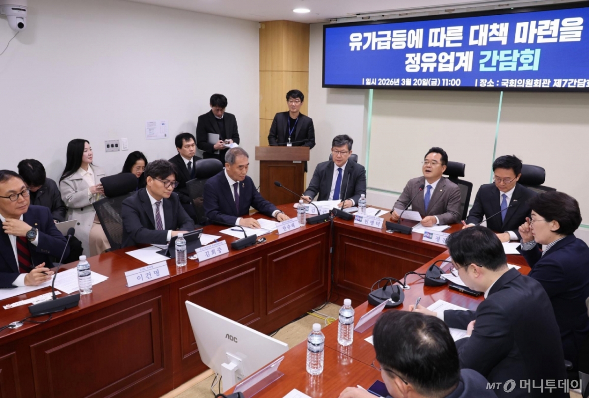 ![[서울=뉴시스] 김금보 기자 = 민병덕 더불어민주당 을지로위원회 위원장이 20일 오전 서울 여의도 국회 의원회관에서 열린 '유가급등에 따른 대책 마련을 위한 정유업계 간담회' 에서 발언을 하고 있다. 2026.03.20. kgb@newsis.com /사진=김금보](https://thumb.mt.co.kr/cdn-cgi/image/f=avif/21/2026/03/2026032013071182362_1.jpg)