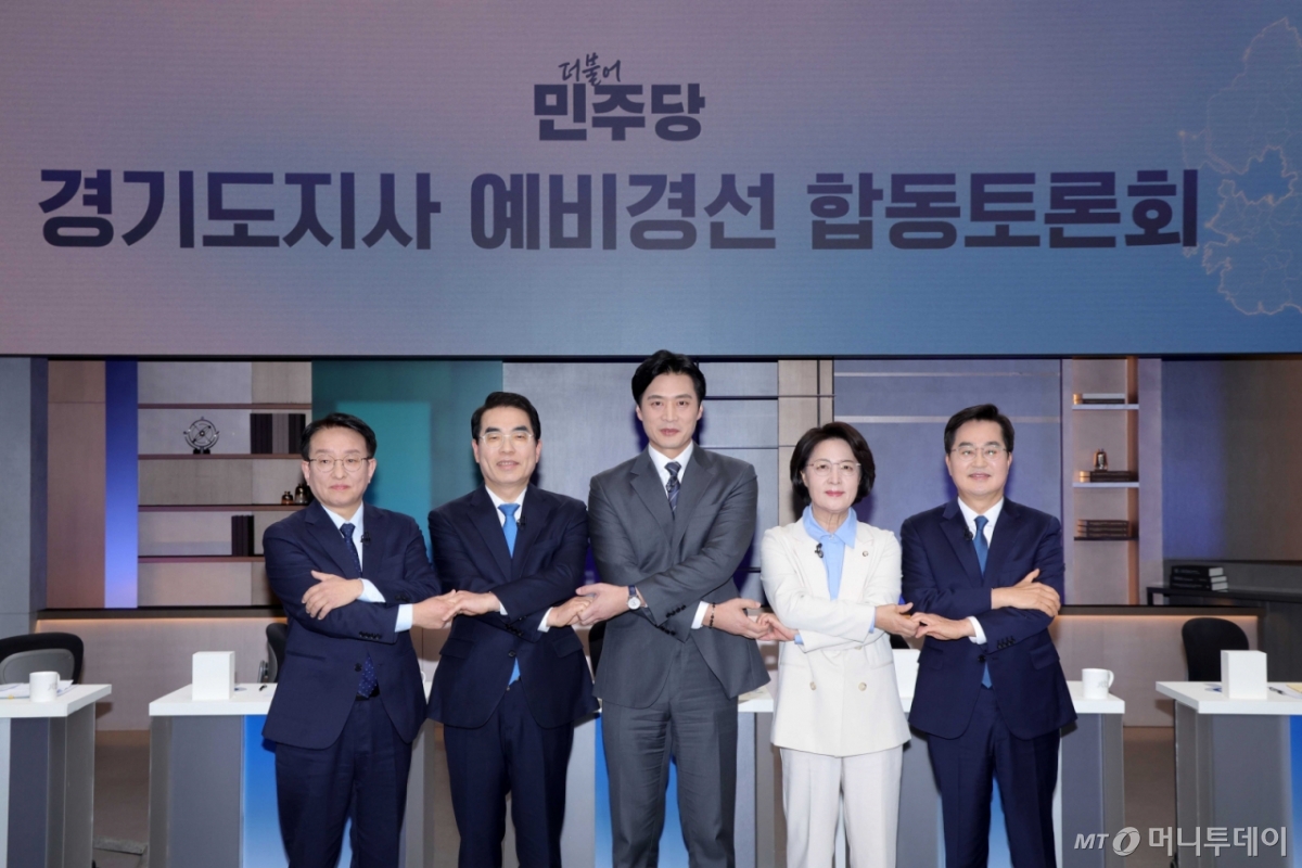 ![[서울=뉴시스] 국회사진기자단 = 19일 서울 마포구 JTBC 에서 열린 더불어민주당 경기도지사 예비경선 합동토론회에서 예비후보들이 기념사진을 찍고 있다. 왼쪽부터 권칠승 의원, 양기대 전 의원, 한준호 의원, 추미애 의원, 김동연 경기도지사. 2026.03.19. photo@newsis.com /사진=](https://thumb.mt.co.kr/cdn-cgi/image/f=avif/21/2026/03/2026032218392842985_1.jpg)