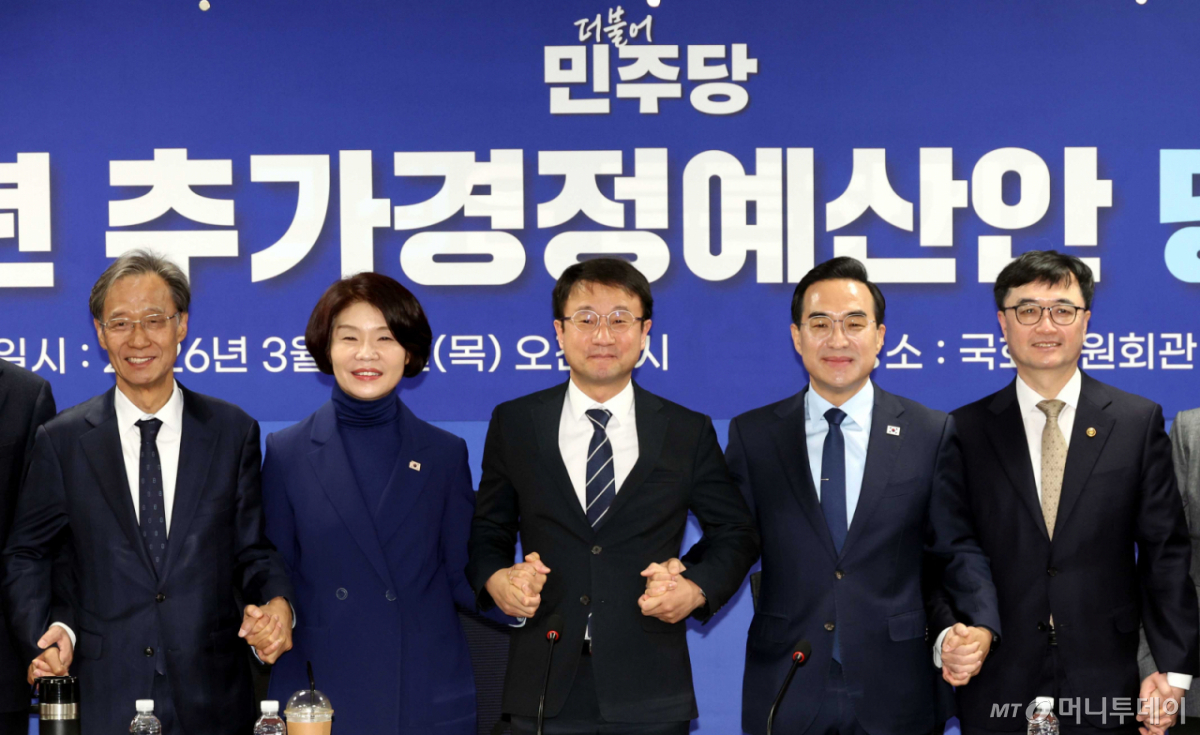 [the300] [서울=뉴시스] 조성봉 기자 = 박홍근 기획예산처 장관, 한병도 더불어민주당 원내대표, 한정애 정책위의장 등이 26일 오전 서울 여의도 국회 의원회관에서 열린 2026년 추가경정예산안 당정협의에서 기념촬영을 하고 있다.왼쪽부터 유동수 의원, 한 정책위의장, 한 원내대표, 박 장관, 임기근 기획예산처 차관. 2026.03.26. [email protected] /사진=조성봉 26일 백승아 더불어민주당 원내대변인 정책조정회의 백브리핑. 독자들의 PICK! 홍서범·조갑경 아들, 아내 임신 중 '여교사와 불륜'…"위자료 배상" 아들 불륜설에 홍서범 "아직 소송 중"...조갑경은 '라스' 예고편 등장 아내 산후조리원에 있는데...'친구 여친'과 불륜 남편, 성폭행 고소전까지 40억 건물주 된 이해인..."월 이자 600만원, 모르고 계약" 멘붕