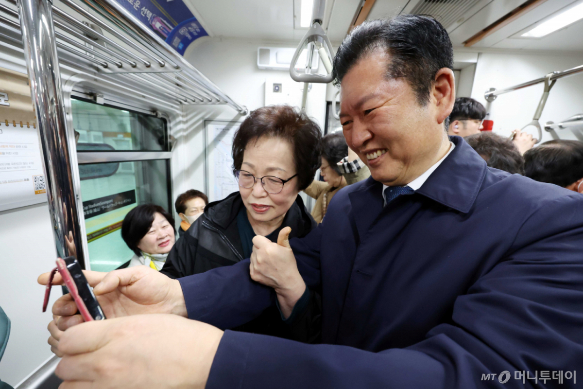 ![[서울=뉴시스] 조성봉 기자 = 정청래 더불어민주당 대표가 공공부문 차량 5부제 동참을 위해 30일 오전 자택에서 지하철을 타고 국회로 출근 중 시민과 셀카를 찍고 있다. 2026.03.30. suncho21@newsis.com /사진=조성봉](https://thumb.mt.co.kr/cdn-cgi/image/f=avif/21/2026/03/2026033008552918691_1.jpg)