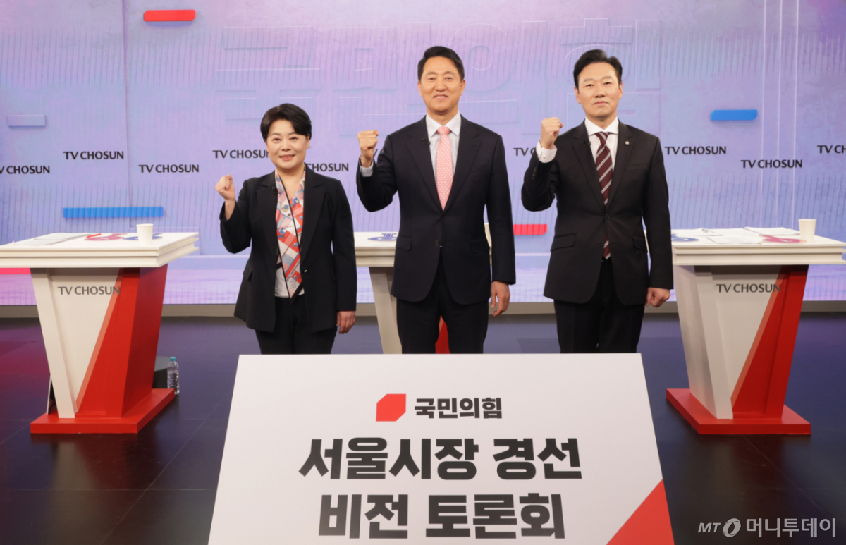 국민의힘 오세훈·박수민·윤희숙 서울시장 예비후보들은 31일 서울 중구 TV조선 스튜디오에서 열린 '서울시장 경선 비전토론회'에 참석했다.