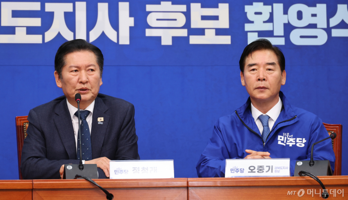 ![[서울=뉴시스] 김금보 기자 = 정청래 더불어민주당 대표가 1일 오후 서울 여의도 국회에서 열린 오중기 경북도지사 예비후보 환영식에서 인사말을 하고 있다. 2026.04.01.kgb@newsis.com /사진=김금보](https://thumb.mt.co.kr/cdn-cgi/image/f=avif/21/2026/04/2026040117480626587_1.jpg)