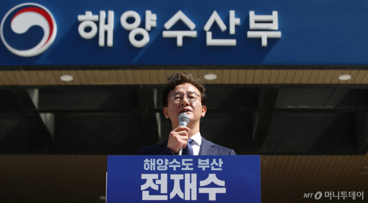 ![[부산=뉴시스] 하경민 기자 = 전재수 더불어민주당 국회의원이 2일 오전 부산 동구 해양수산부 임시청사 앞에서 기자회견을 열고 6·3전국동시지방선거 부산시장 선거 출마선언을 하고 있다. 2026.04.02. yulnetphoto@newsis.com /사진=이아름](https://thumb.mt.co.kr/cdn-cgi/image/f=avif/21/2026/04/2026040211284726867_2.jpg)