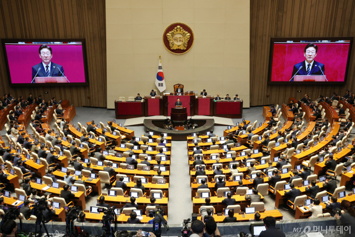 박충권 국민의힘 원내수석대변인은 2일 이 대통령의 시정연설이 끝난 뒤 곧바로 서면 논평을 내고 "지난 3월 우리나라 국가 총부채가 처음으로 6500조원을 돌파했다"며 "이런 상황에서 초과 세수 25조원이 발생했다면, 먼저 빚부터 갚는 것이 상식"이라고 지적했다.