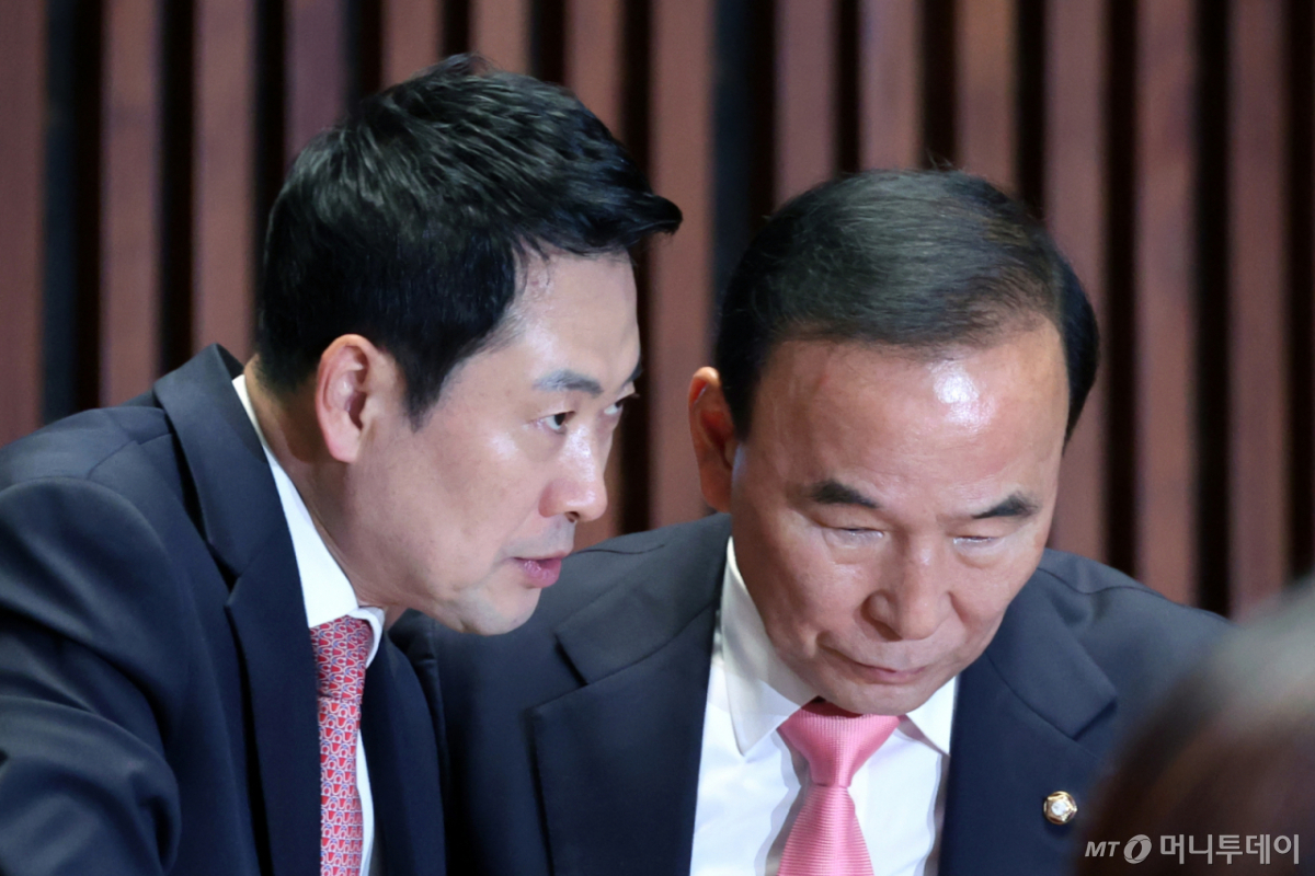 ![[서울=뉴시스] 고승민 기자 = 국민의힘이 1일 박덕흠 의원을 당 공천관리위원장에 임명한 것으로 알려졌다. 사진은 지난달 31일 서울 여의도 국회에서 열린 의원총회에서 대화하는 장 대표와 박 의원 모습. 2026.04.01. kkssmm99@newsis.com /사진=고승민](https://thumb.mt.co.kr/cdn-cgi/image/f=avif/21/2026/04/2026040214594736825_1.jpg)