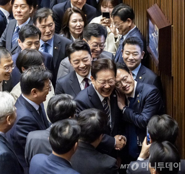 오후 2시10분쯤 민주당 의원들이 도열한 가운데 이 대통령이 모습을 드러냈다. 환한 미소의 이 대통령은 입구 쪽에 서 있던 정청래 당대표와 한병도 원내대표 등을 시작으로 의원 한명 한명과 손을 맞잡고 인사를 나눴다.