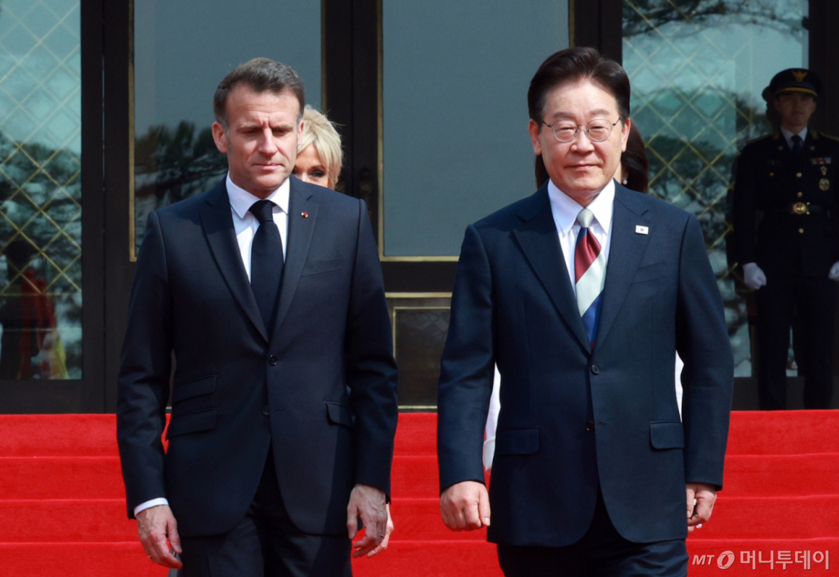 ![[서울=뉴시스] 고범준 기자 = 이재명 대통령과 에마뉘엘 마크롱 프랑스 대통령이 3일 청와대에서 열린 공식환영식에 입장하고 있다. 2026.04.03. bjko@newsis.com /사진=고범준](https://thumb.mt.co.kr/cdn-cgi/image/f=avif/21/2026/04/2026040310245269802_2.jpg)