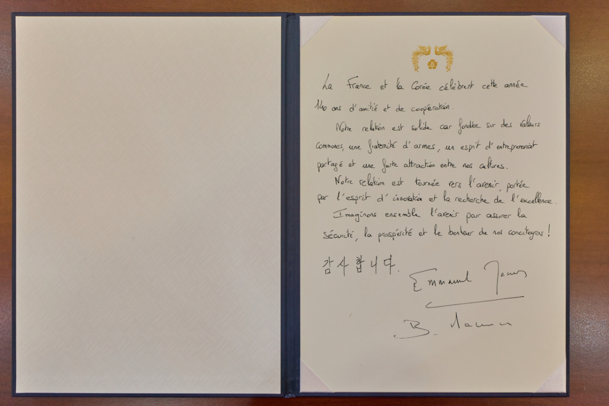 마크롱 대통령은 마지막의 '감사합니다' 문구는 한국어로 적었다. 마크롱 대통령이 방명록 작성을 마치자 김 여사는 "너무 잘 쓰셨다"라고 했다. 이 대통령이 마크롱 대통령이 쓴 문구를 가리키며 영어로 "코리안(한국어)"이라고 말하자 마크롱 대통령은 "괜찮나요(is it okay?)"라고 되물었다. 김 여사가 재차 "네, 맞습니다"라고 화답해 좌중에서 웃음이 터지기도 했다.