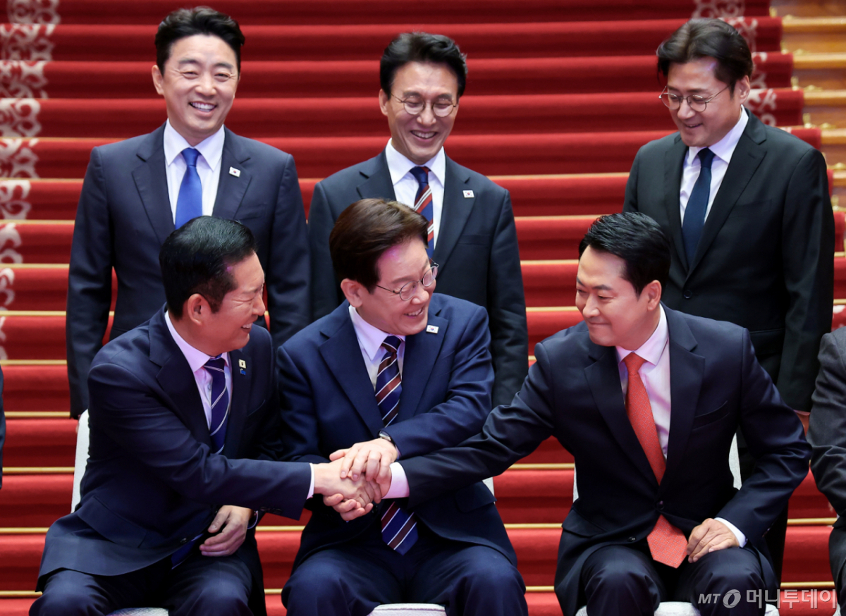 ![[서울=뉴시스] 최동준 기자 = 이재명 대통령이 7일 청와대에서 열린 여야정 민생경제협의체 회담 및 오찬에 더불어민주당 정청래 대표, 한병도 원내대표, 국민의힘 장동혁 대표, 송언석 원내대표 등 참석자들과 입장하고 있다. 2026.04.07. photocdj@newsis.com /사진=최동준](https://thumb.mt.co.kr/cdn-cgi/image/f=avif/21/2026/04/2026040715562869954_6.jpg)