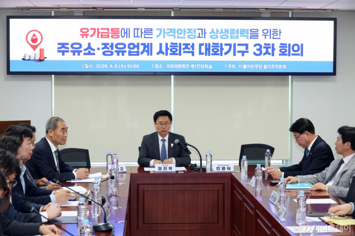 ![[서울=뉴시스] 고승민 기자 = 정진욱 더불어민주당 의원이 8일 서울 여의도 국회 의원회관에서 열린 '유가급등에 따른 가격안정과 상생협력을 위한 주유소, 정유업계 사회적 대화기구 3차 회의'에서 인사말을 하고 있다. 2026.04.08. kkssmm99@newsis.com /사진=고승민](https://thumb.mt.co.kr/cdn-cgi/image/f=avif/21/2026/04/2026040816492545743_1.jpg)