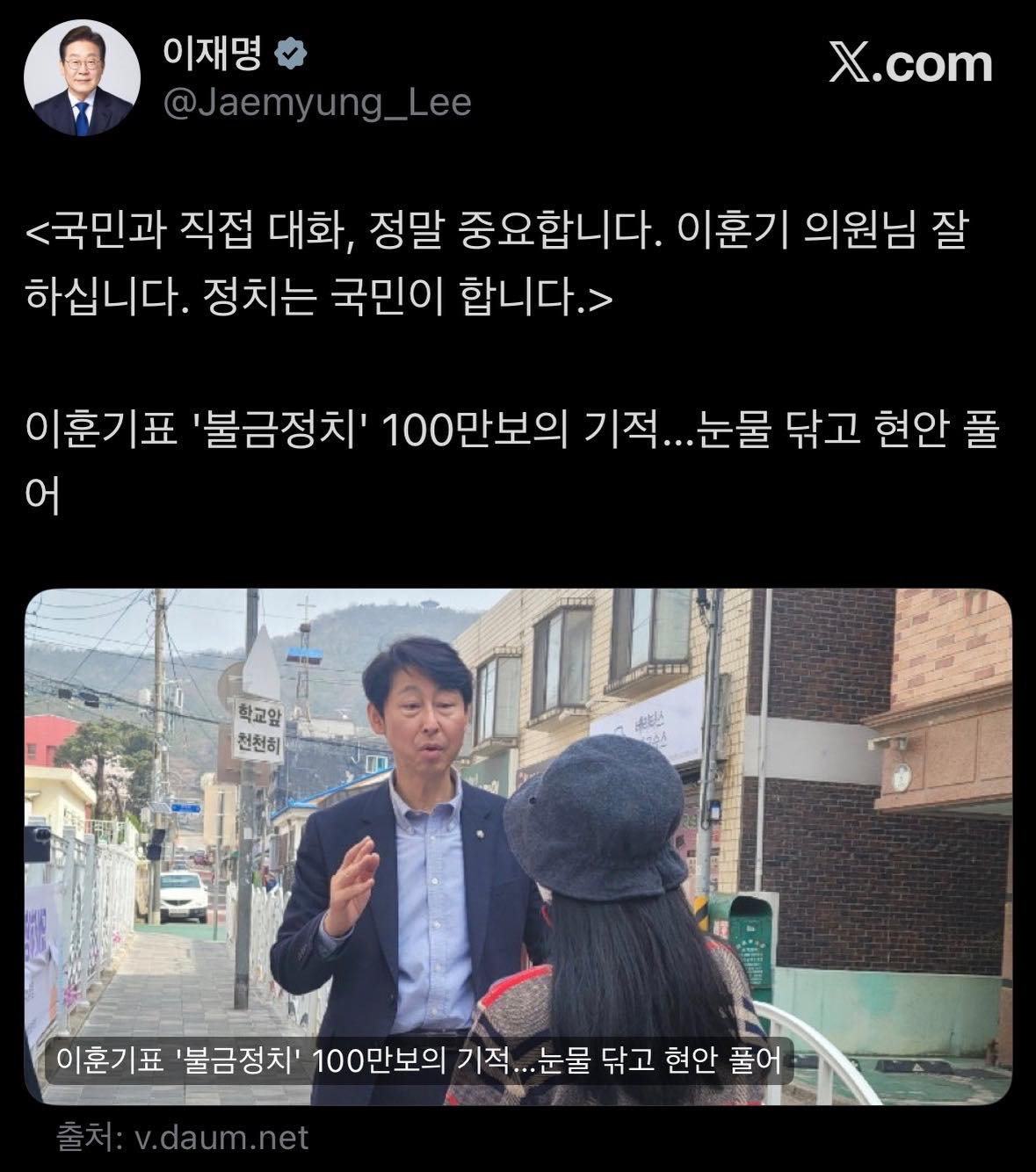9일 정치권에 따르면 이 대통령은 전날 SNS(소셜미디어)에 이 의원의 '100회차 동네한바퀴' 관련 기사를 공유하며 "정치는 국민이 한다. 잘 하고 계시다"고 적었다.