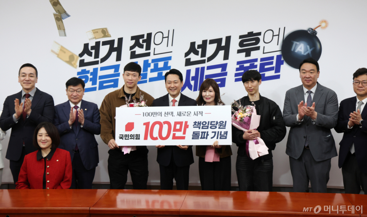 이날 행사에 참석한 100만번째 국민의힘 책임당원 3명은 장 대표에게 "진짜 어려운 상황의 나라를 구출해 달라"며 "책임 있는 정치를 해달라"고 부탁했다.