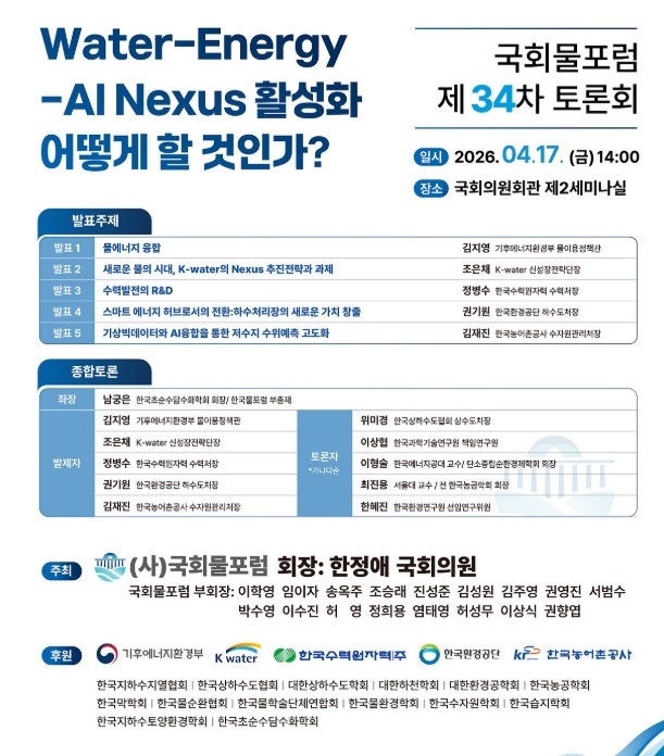 국회물포럼이 오는 17일 서울 여의도 국회에서 'Water-Energy-AI Nexus(물과 에너지, 인공지능 연결) 활성화 어떻게 할 것인가?' 주제로 토론회를 연다.