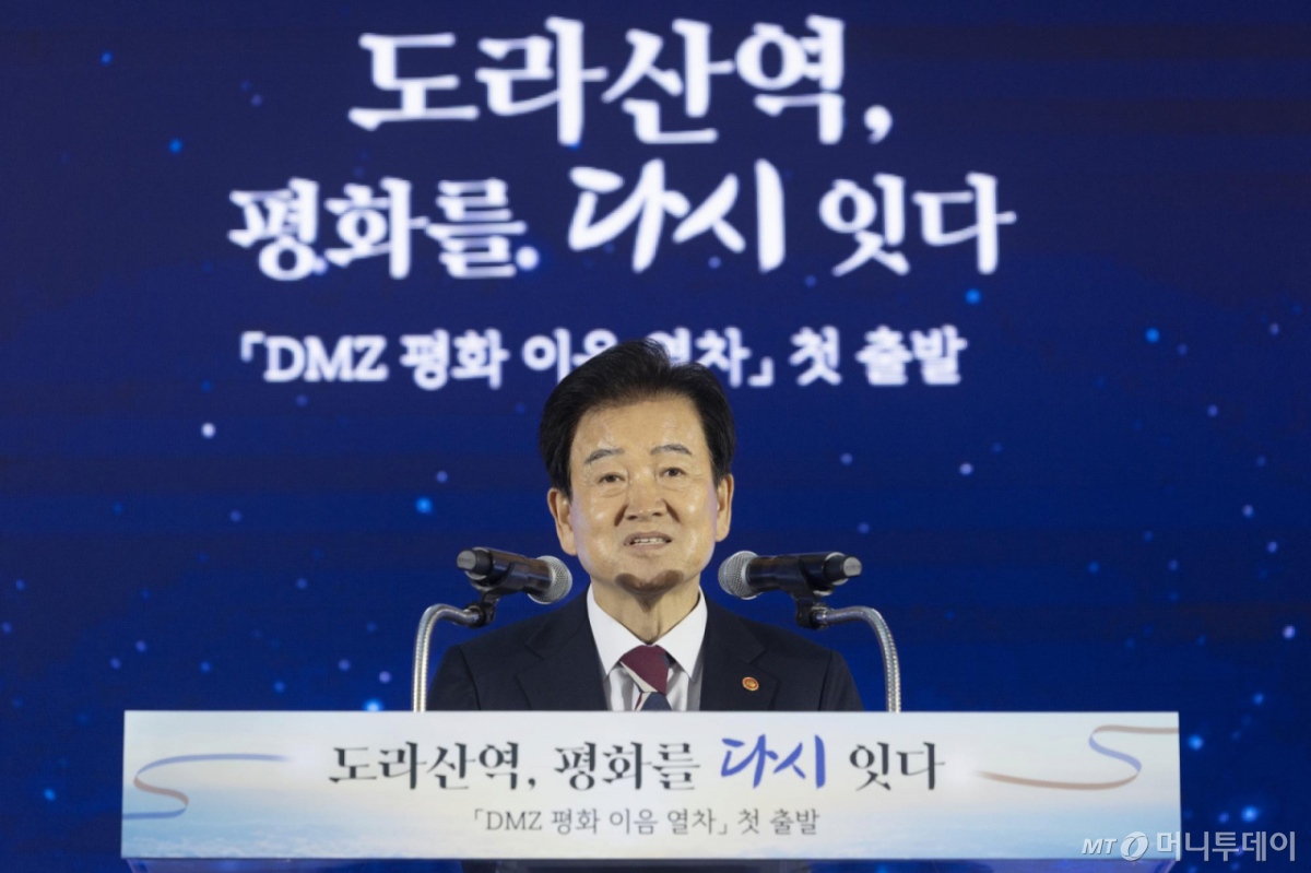 정 장관은 "도라산역은 단순한 기차역이 아니다. 분단의 끝에서 남북을 연결하고 민간인통제선(민통선) 안에서 평화를 준비하는 희망의 정거장"이라며 "남쪽에 있는 역 가운데 국제선 승강장이 있는 역은 도라산역이 유일하다. 여기서 출발해서 개성·평양·신의주를 거쳐서 파리, 런던까지 갈 수 있는 날은 마침내 오고야 말 것"이라고 했다.