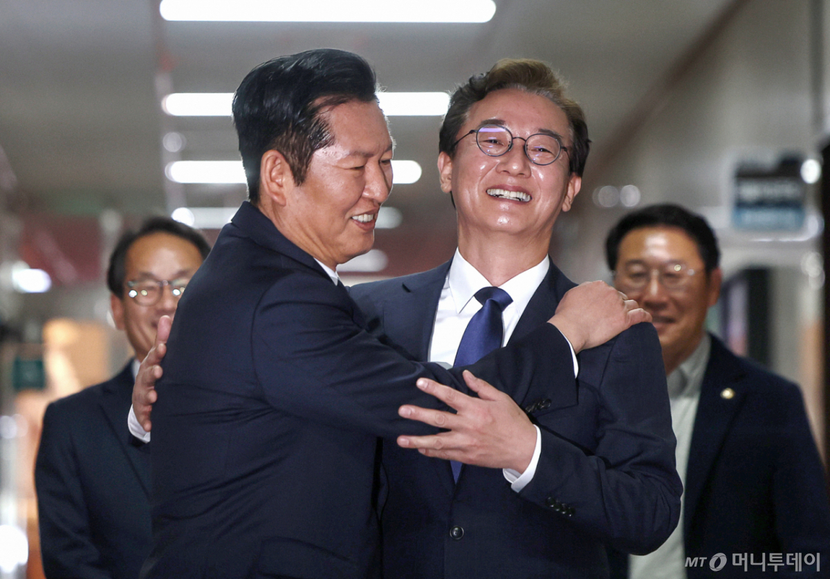 ![[서울=뉴시스] 김명년 기자 = 정청래 더불어민주당 대표가 10일 서울 여의도 국회에서 전재수 부산시장 후보와 차담하기 전 포옹하며 맞이하고 있다. 2026.04.10. kmn@newsis.com /사진=김명년](https://thumb.mt.co.kr/cdn-cgi/image/f=avif/21/2026/04/2026041015180175903_1.jpg)
