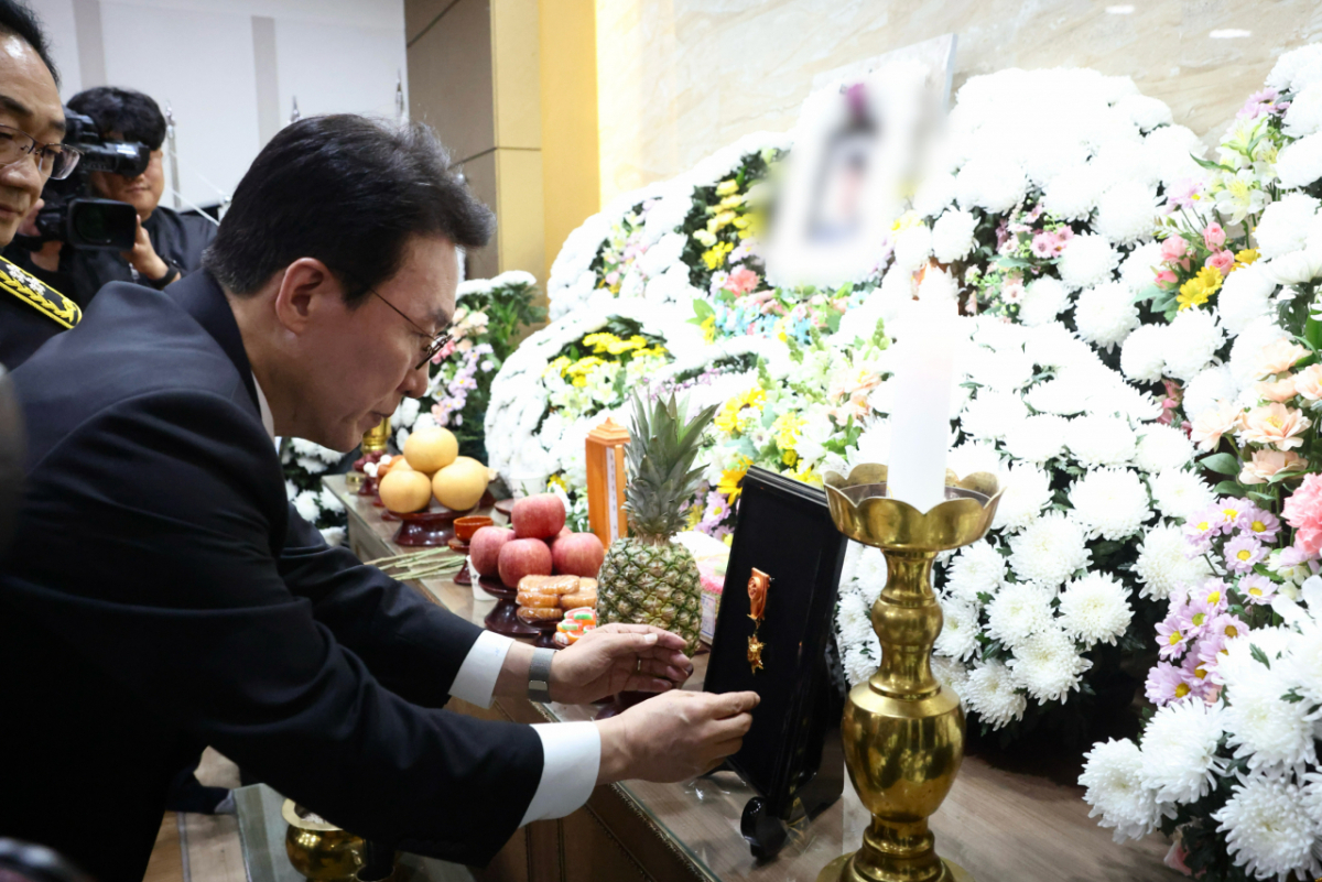 김민석 국무총리가 전남 완도군의 냉동 창고 화재 현장에서 순직한 소방관들의 빈소를 찾아 조문했다.