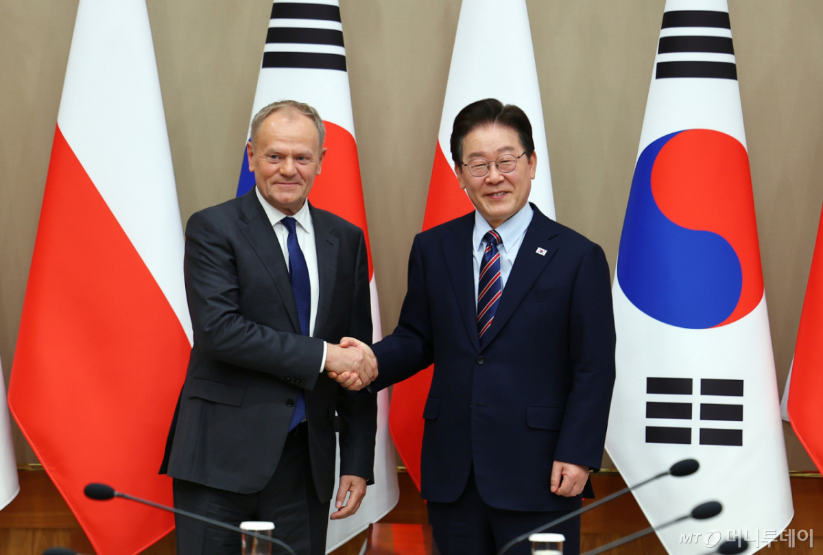 [the300] (서울=뉴스1) 이재명 기자 = 이재명 대통령과 도날드 투스크 폴란드 총리가 13일 청와대에서 열린 한·폴란드 확대 회담에서 기념촬영을 하고 있다. (청와대통신사진기자단) 2026.4.13/뉴스1 Copyright © 뉴스1. All rights reserved. 무단 전재 및 재배포, AI학습 이용 금지. /사진=(서울=뉴스1) 이재명 기자 13일 청와대, 한-폴란드 공동언론발표문. 독자들의 PICK! 양준혁, 사업 실패로 '50억' 날렸다…"선수 시절 번 돈 다 까먹어" "이혼은 승자 없어" 이범수 혼자 남은 집 공개...휑한 거실서 혼밥 '음주운전' 야구선수, 여성 팬에 막말..."타이어보다 못한 뚱녀" 지예은, '스맨파' 댄서 바타와 열애 중…"교회 인연, 응원 부탁"