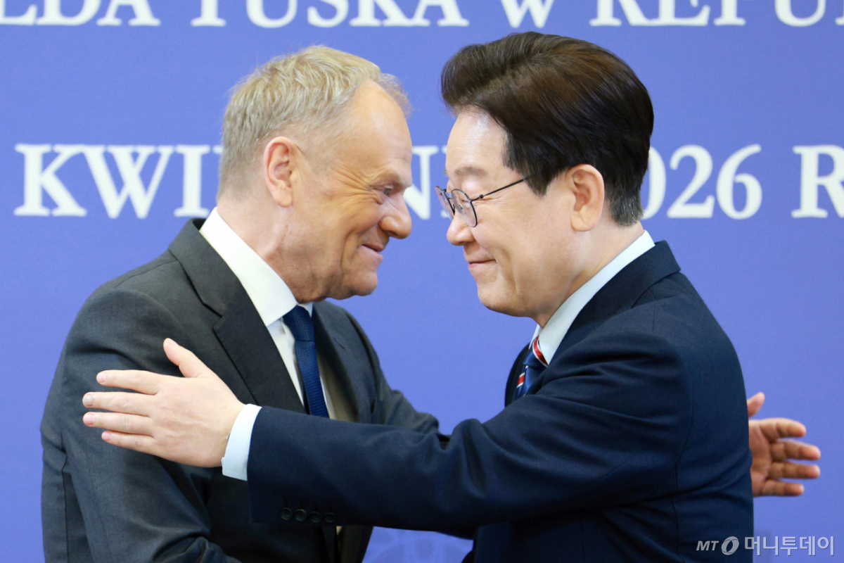 ![[서울=뉴시스] 고범준 기자 = 이재명 대통령과 도날드 투스크 폴란드 총리가 13일 청와대에서 한-폴란드 공동언론발표를 마친 뒤 포옹하고 있다. 2026.04.13. bjko@newsis.com /사진=고범준](https://thumb.mt.co.kr/cdn-cgi/image/f=avif/21/2026/04/2026041313284740546_1.jpg)