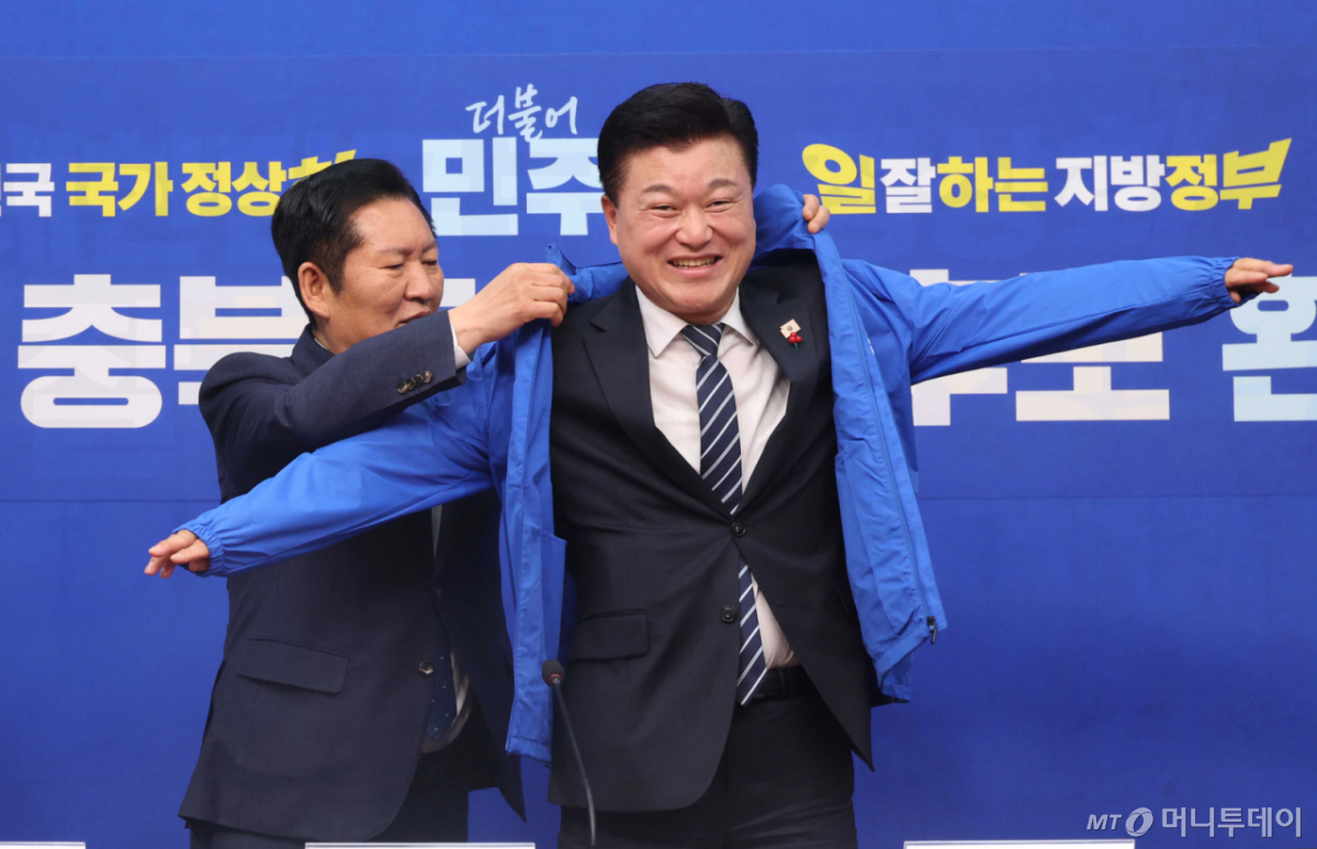 ![[서울=뉴시스] 조성봉 기자 = 정청래 더불어민주당 대표가 14일 오후 서울 여의도 국회에서 열린 신용한 충북도지사 후보 환영식에서 신 후보에게 당 점퍼를 입혀주고 있다. 2026.04.14. suncho21@newsis.com /사진=조성봉](https://thumb.mt.co.kr/cdn-cgi/image/f=avif/21/2026/04/2026041413551539284_1.jpg)