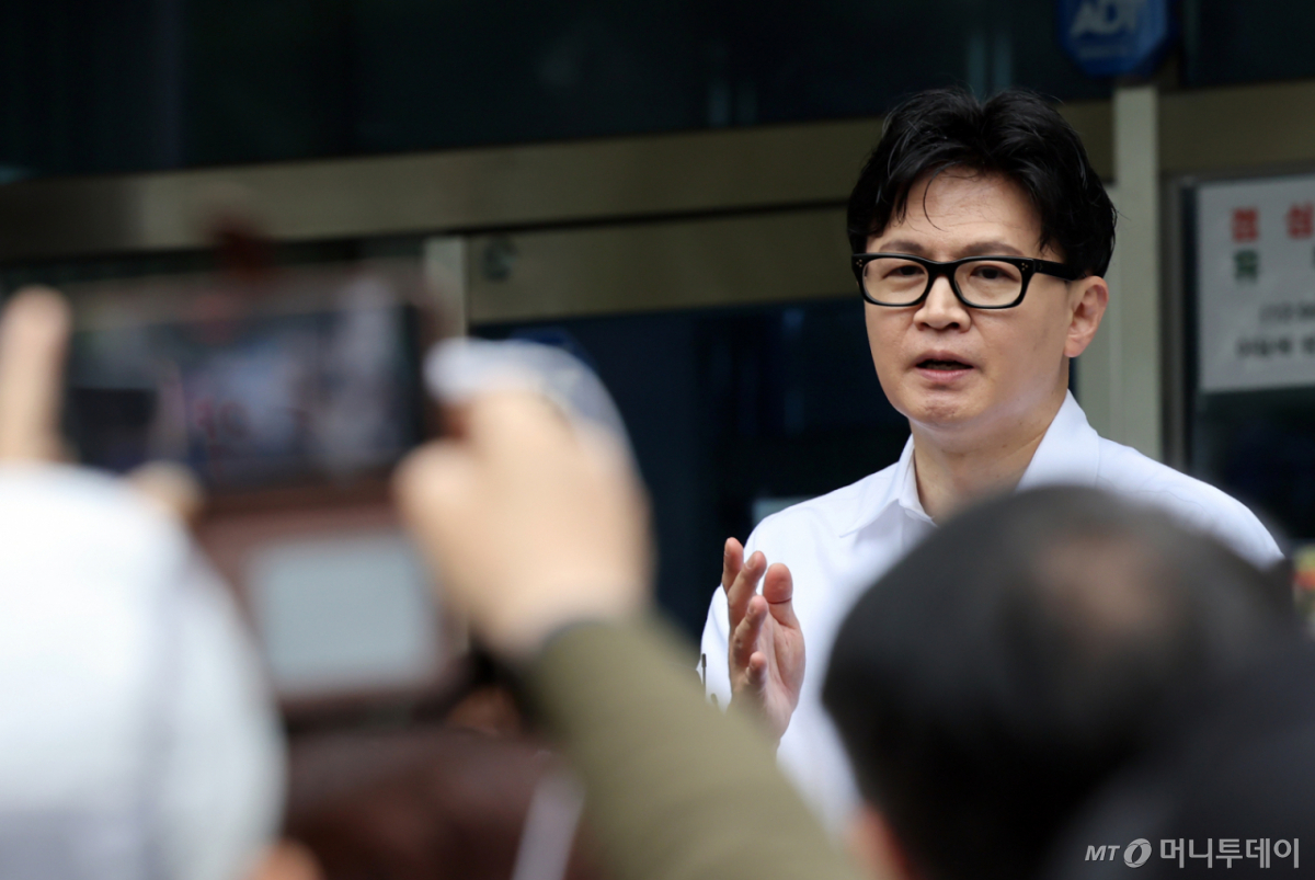 ![[부산=뉴시스] 하경민 기자 = 한동훈 전 국민의힘 대표가 14일 부산 북구 만덕2동행정복지센터에서 전입신고를 한 뒤 소감을 밝히고 있다. 2026.04.14. yulnetphoto@newsis.com /사진=하경민](https://thumb.mt.co.kr/cdn-cgi/image/f=avif/21/2026/04/2026041709095396744_1.jpg)