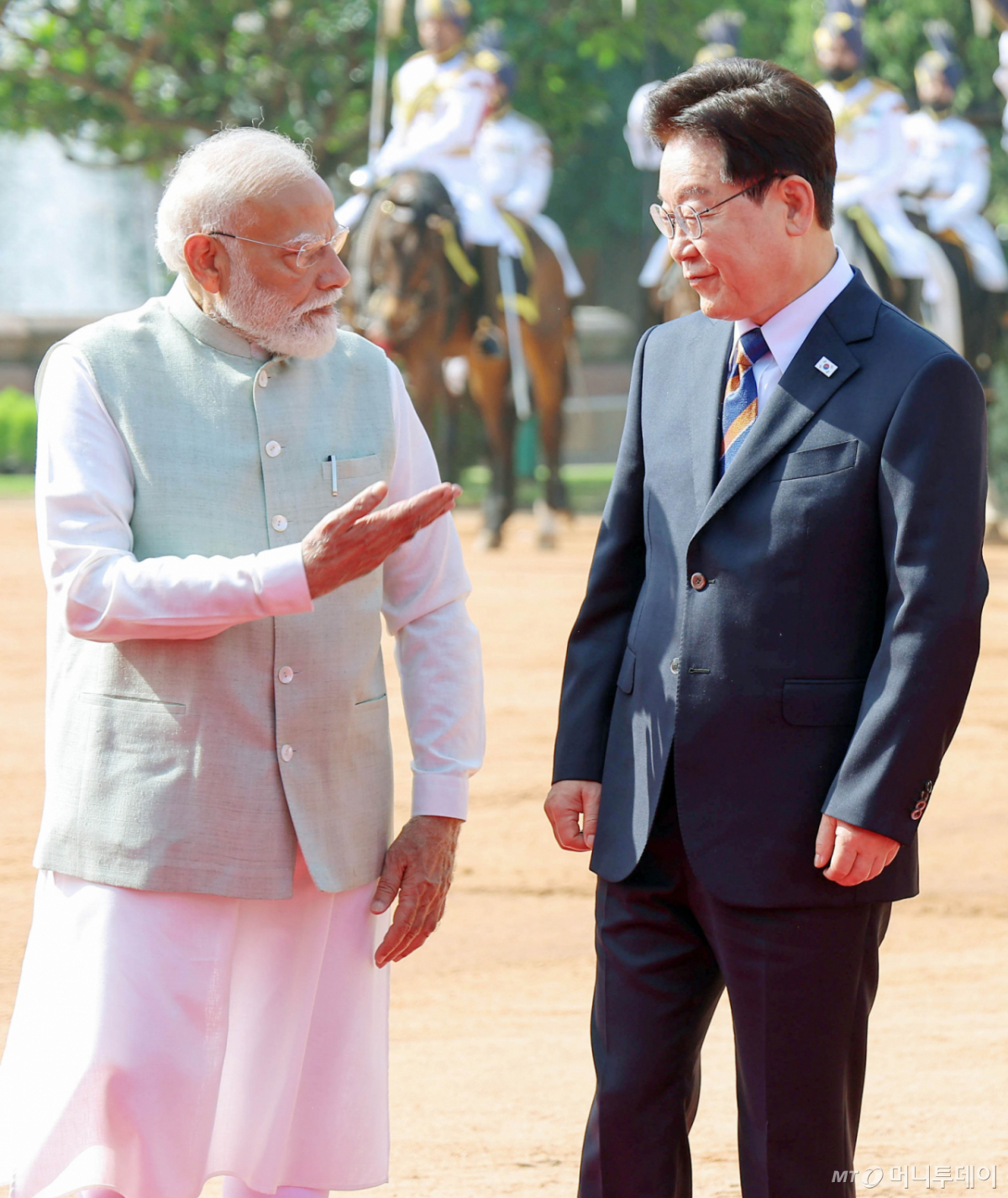 인도를 국빈 방문 중인 이재명 대통령이 20일 공식환영식 참석과 간디 추모공원 헌화를 통해 나렌드라 모디 인도 총리와의 정상회담 일정에 돌입했다. 이 대통령은 취임 후 세 번째로 대면한 모디 총리와 환영식이 진행되는 내내 친근한 모습을 보여 눈길을 끌었다.