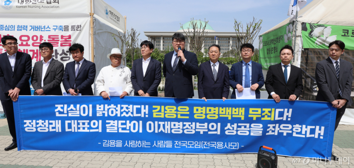 '김용을 사랑하는 사람들 전국모임'(전국용사모)은 21일 서울 여의도 국회에서 열은 기자회견에서 "우리는 이 자리에서 정청래 당 대표와 지도부에 간곡히 호소드린다"며 이같이 말했다. 이날 기자회견에는 김 전 부원장의 변호인인 임윤태 변호사·신알찬 변호사 등이 참석했다.