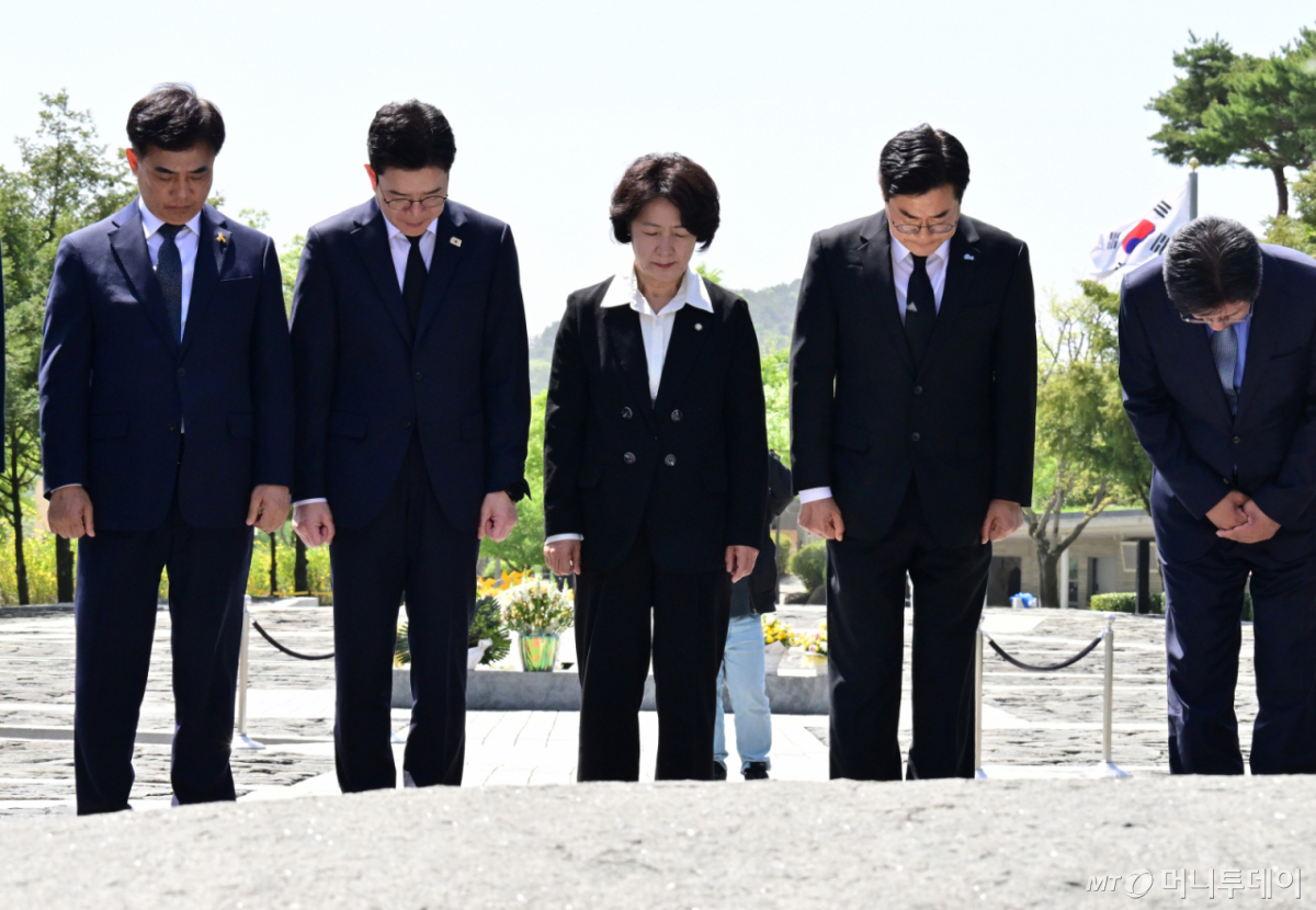 ![[김해=뉴시스] 차용현 기자 = 21일 오후 더불어민주당 수도권(서울·경기·인천) 광역단체장 선거 후보가 경남 김해시 진영읍 봉하마을 고 노무현 전 대통령 묘역을 찾아 참배하고 있다. 왼쪽부터 정원오 서울시장 후보, 추미애 경기지사 후보, 박찬대 인천시장 후보 등이다. 2026.04.21. con@newsis.com /사진=차용현](https://thumb.mt.co.kr/cdn-cgi/image/f=avif/21/2026/04/2026042115255638274_1.jpg)