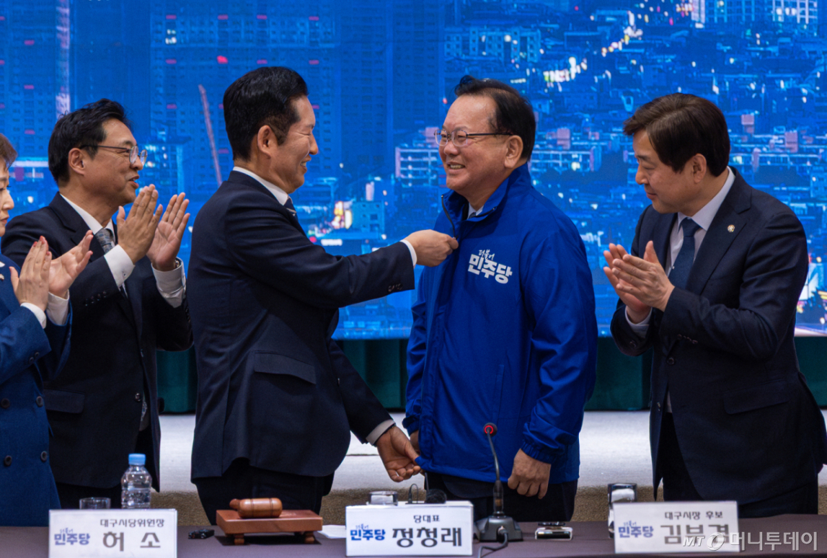![[서울=뉴시스] 정청래 더불어민주당 대표가 8일 대구 북구 인터불고 엑스코 호텔에서 열린 현장 최고위원회의에서 대구시장 후보인 김부겸 전 국무총리에게 당 점퍼를 입혀주고 있다.(사진=더불어민주당 제공) 2025.04.08. *재판매 및 DB 금지 /사진=](https://thumb.mt.co.kr/cdn-cgi/image/f=avif/21/2026/04/2026042409095582466_1.jpg)