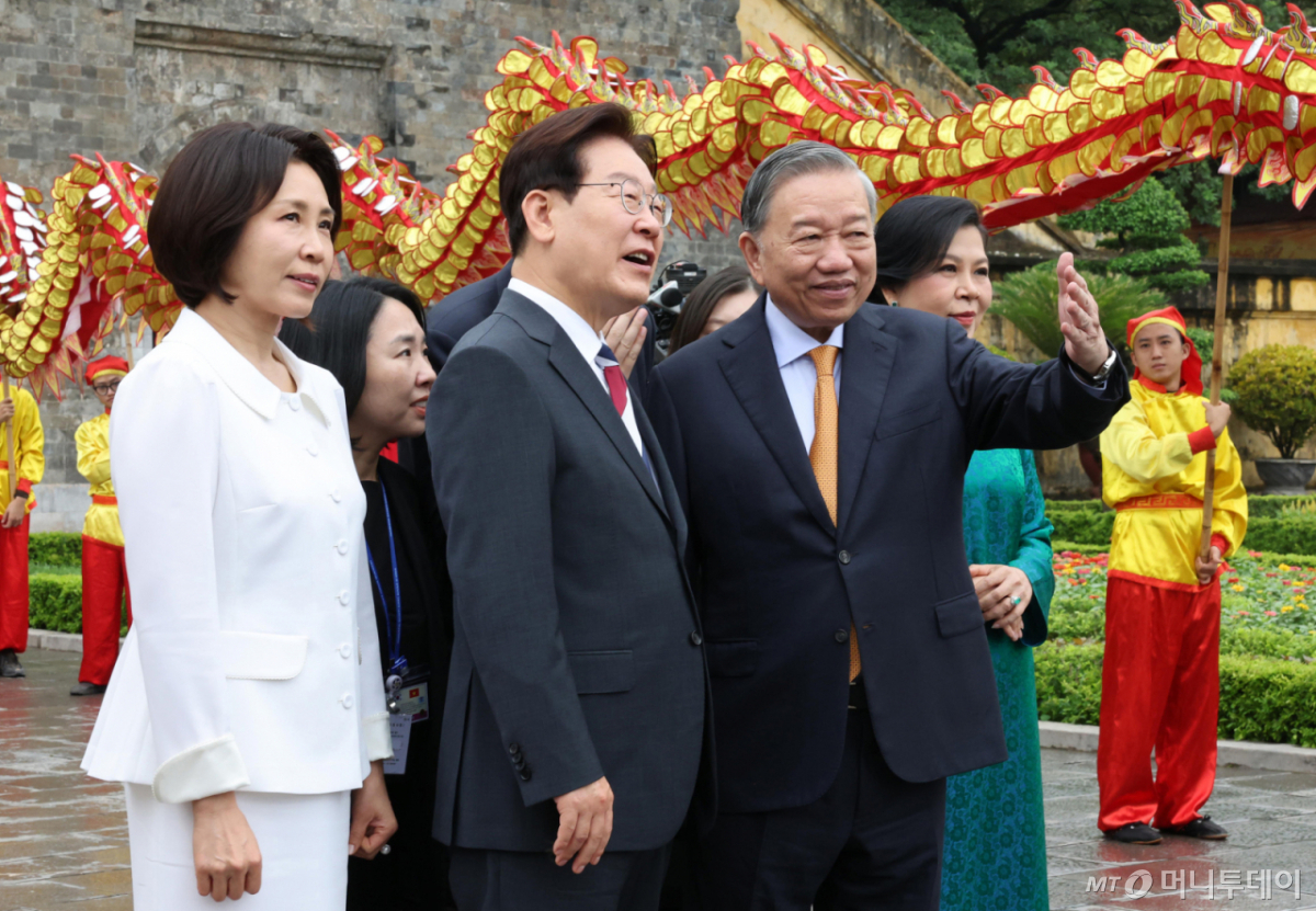 ![[하노이=뉴시스] 고범준 기자 = 이재명 대통령과 김혜경 여사가 24일(현지 시간) 유네스코 세계 문화유산으로 등재된 베트남 하노이 탕롱황성을 방문해 또 럼 당 서기장 겸 국가주석, 응오 프엉 리 여사와 전통 공연을 관람한 뒤 공연단과 함께 기념촬영을 하고 있다. 2026.04.24. bjko@newsis.com /사진=최동준](https://thumb.mt.co.kr/cdn-cgi/image/f=avif/21/2026/04/2026042413252311387_2.jpg)