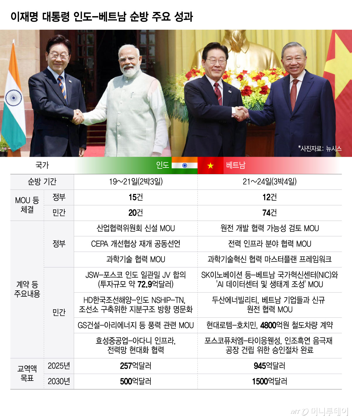 이재명 대통령이 취임 후 첫 인도·베트남 국빈방문 일정을 마치고 24일 귀국한다. '글로벌 사우스' 외교 전략의 핵심 두 국가의 지도부를 만나 경제·사회·문화 등 다방면에서의 협력을 공고히 했다는 평가다.