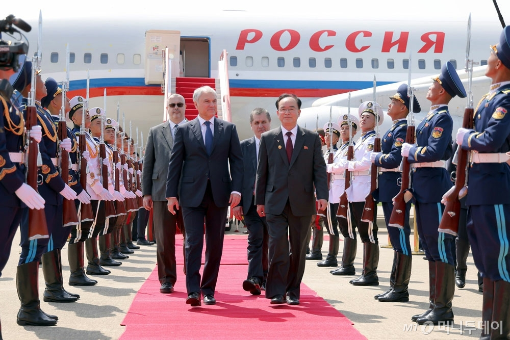 김정은 북한 국무위원장의 최측근으로 북한의 공식 서열 2위로 꼽히는 조용원 최고인민회의 상임위원장이 평양국제공항에서 대표단을 맞았다. 볼로딘 의장 일행은 도착 후 소련군의 항일 무장투쟁을 기념하기 위해 건설된 해방탑을 찾아 화환을 진정하고 소련군 전사자들을 추모했다.
