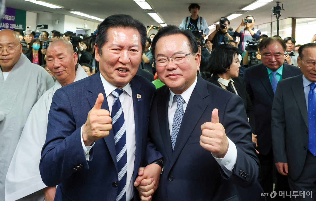 ![[대구=뉴시스] 이무열 기자 = 정청래 더불어민주당 대표와 김부겸 대구시장 예비후보가 26일 대구 달서구 선거사무소 개소식에서 엄지를 들어 보이고 있다. 2026.04.26. lmy@newsis.com /사진=이무열](https://thumb.mt.co.kr/cdn-cgi/image/f=avif/21/2026/04/2026042614265795600_1.jpg)