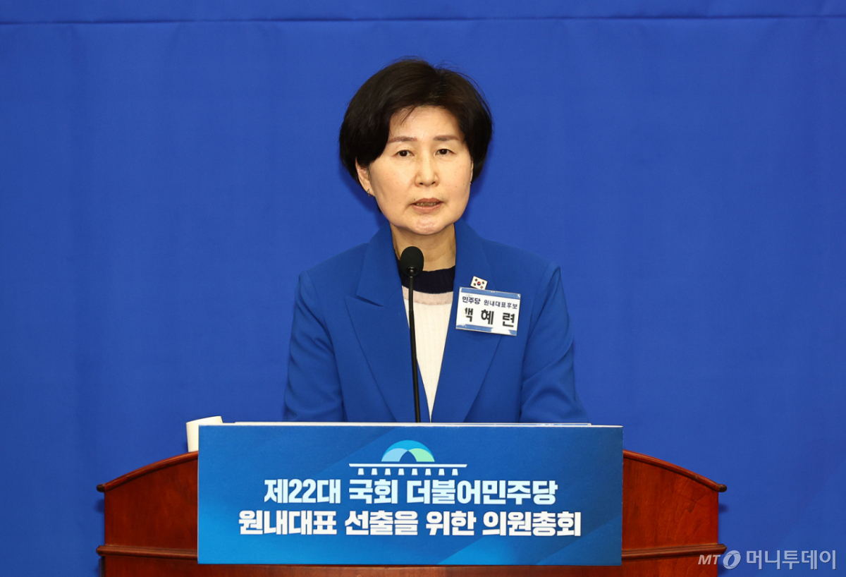 ![[서울=뉴시스] 김명년 기자 = 백혜련 더불어민주당 원내대표 후보자가 11일 오후 서울 여의도 국회에서 열린 원내대표 선출을 위한 의원총회에서 결선투표 전 정견발표하고 있다. 2026.01.11. kmn@newsis.com /사진=김명년](https://thumb.mt.co.kr/cdn-cgi/image/f=avif/21/2026/04/2026042708251548849_1.jpg)