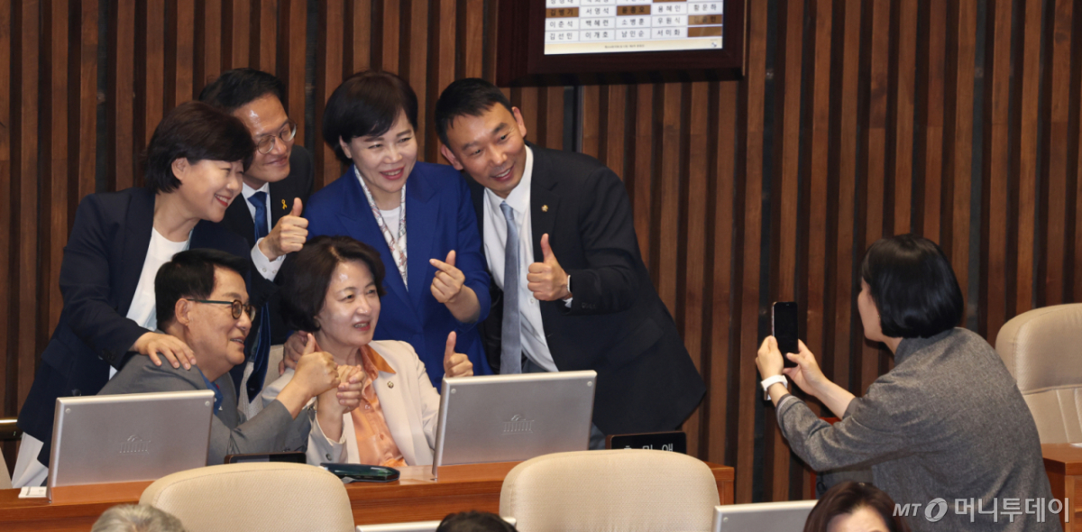 ![[서울=뉴시스] 김금보 기자 = 더불어민주당 경기도지사 후보인 추미애 의원이 28일 오후 서울 여의도 국회에서 열린 제434회국회(임시회) 제8차 본회의에서 출마를 위한 의원직 사퇴를 앞두고 의원들과 기념촬영을 하고 있다. 2026.04.28. kgb@newsis.com /사진=김금보](https://thumb.mt.co.kr/cdn-cgi/image/f=avif/21/2026/04/2026042813272976958_1.jpg)