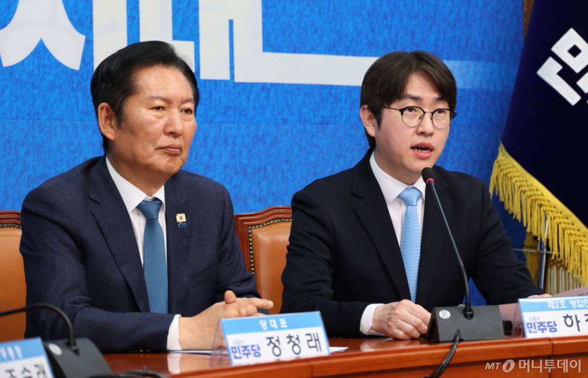 ![[서울=뉴시스] 김금보 기자 = 하정우 전 청와대 AI미래기획수석이 29일 오전 서울 여의도 국회에서 열린 더불어민주당 2차 인재영입식에서 인사말을 하고 있다. 2026.04.29. kgb@newsis.com /사진=김금보](https://thumb.mt.co.kr/cdn-cgi/image/f=avif/21/2026/04/2026042914405348528_1.jpg)