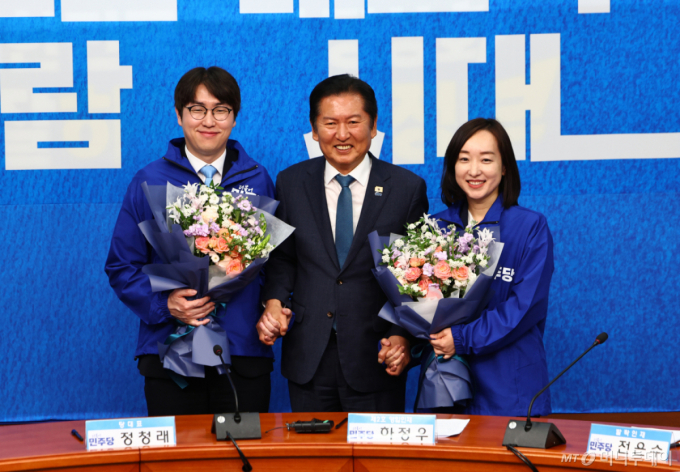정청래 민주당 대표는 이날 두 사람을 보며 "삼고초려를 넘어 삼십고초려를 해서 반드시 모셔 오고 싶었던 인재"라고 소개했다. 하 전 수석에 대해서는 "진짜 부산 토박이"라며 "세상일에 관심이 많고 재치도 넘치고 아주 따뜻한 착한 천재"라고 말했다. 정 대표는 "AI 역량이 곧 국력인 시대에 국가 비전을 완성할 필승 카드"라고도 했다.